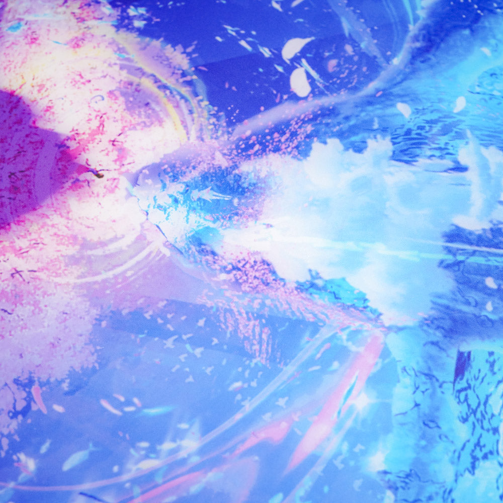 まころん氏の代表的なモチーフである“空を泳ぐクジラ”と“光の粒子”をテーマに、透明感あふれるガラス素材に繊細なアートを再現。